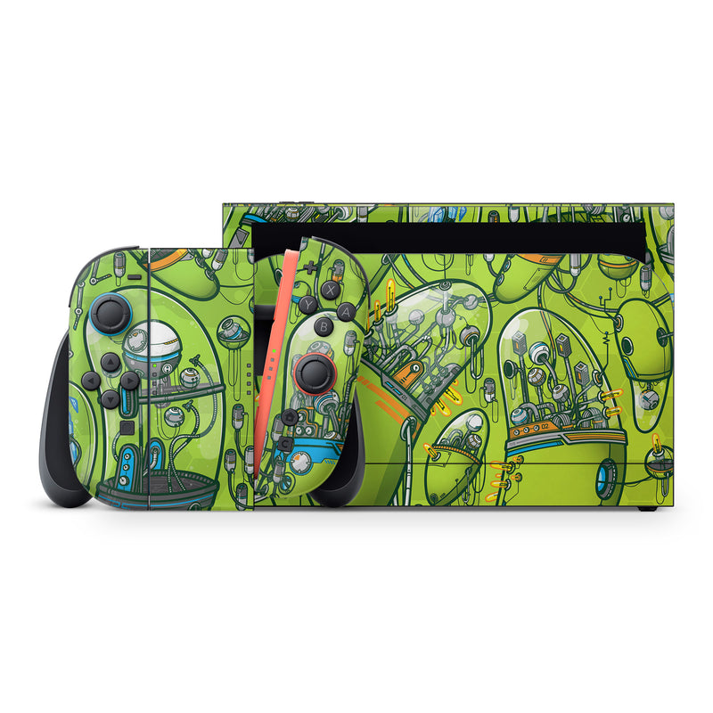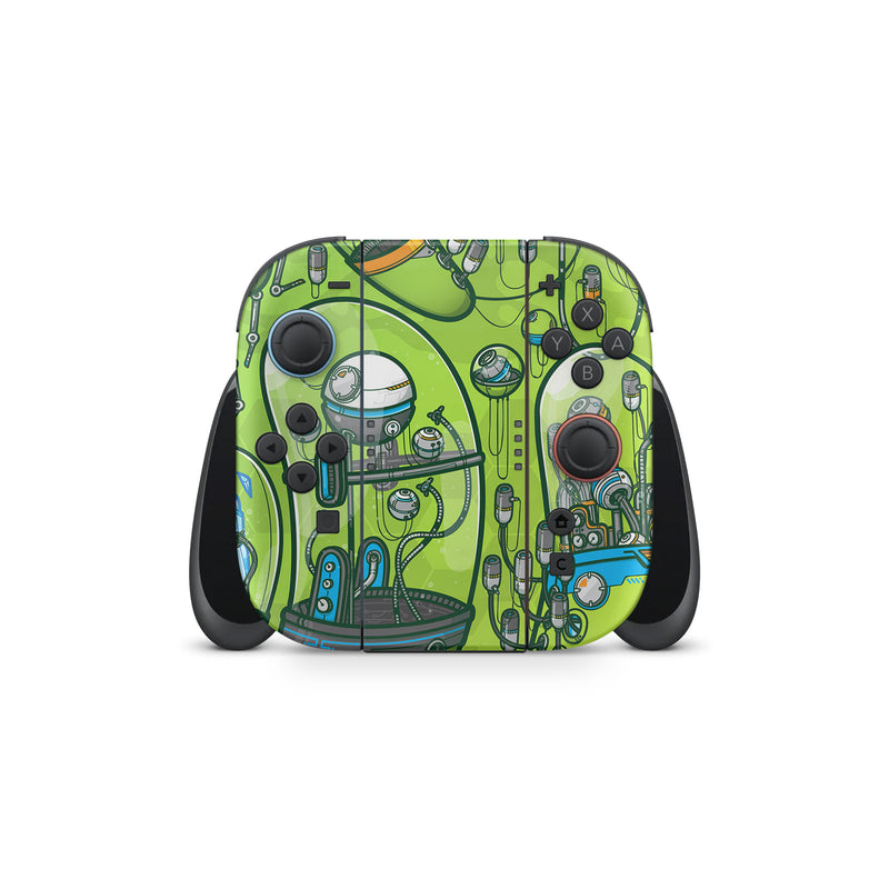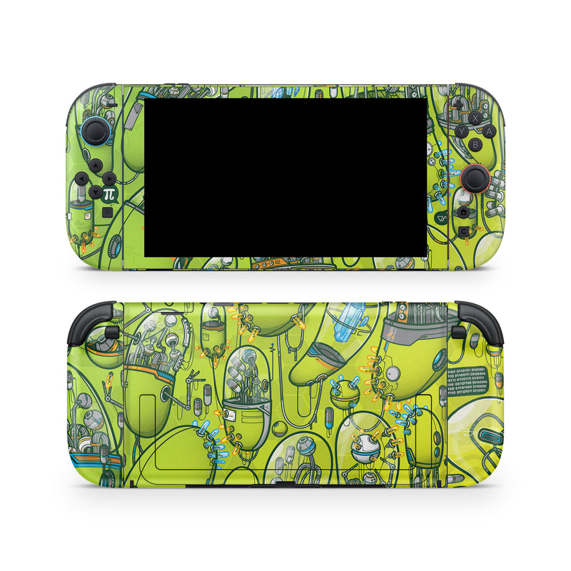 iStyles Nintendo Switch 2 Skin design of Green, Pattern, Yellow, Design, Illustration, Plant, Art, Graphic design, Urban design, with green, blue, gray, yellow, orange colors, and tagged with objects, patterns, green, illustration, limegreen, pattern, technology, vector.