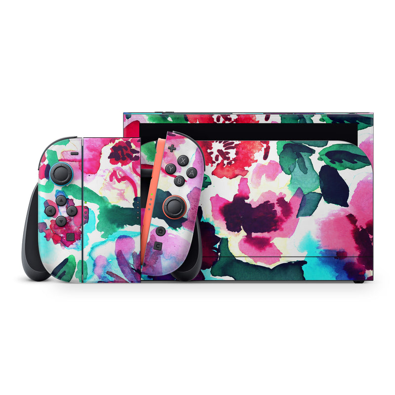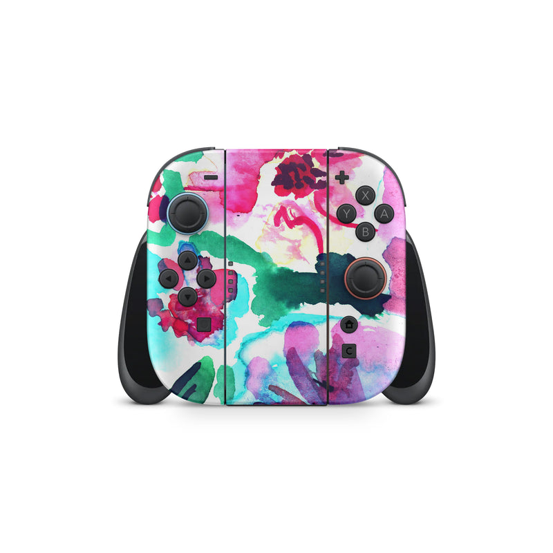 iStyles Nintendo Switch 2 Skin design of Flower, Pink, Petal, Plant, Pattern, Hawaiian hibiscus, Design, Magenta, Flowering plant, Watercolor paint, with white, pink, blue, green, red colors, and tagged with flowers, floral, flowers, nature, watercolor.