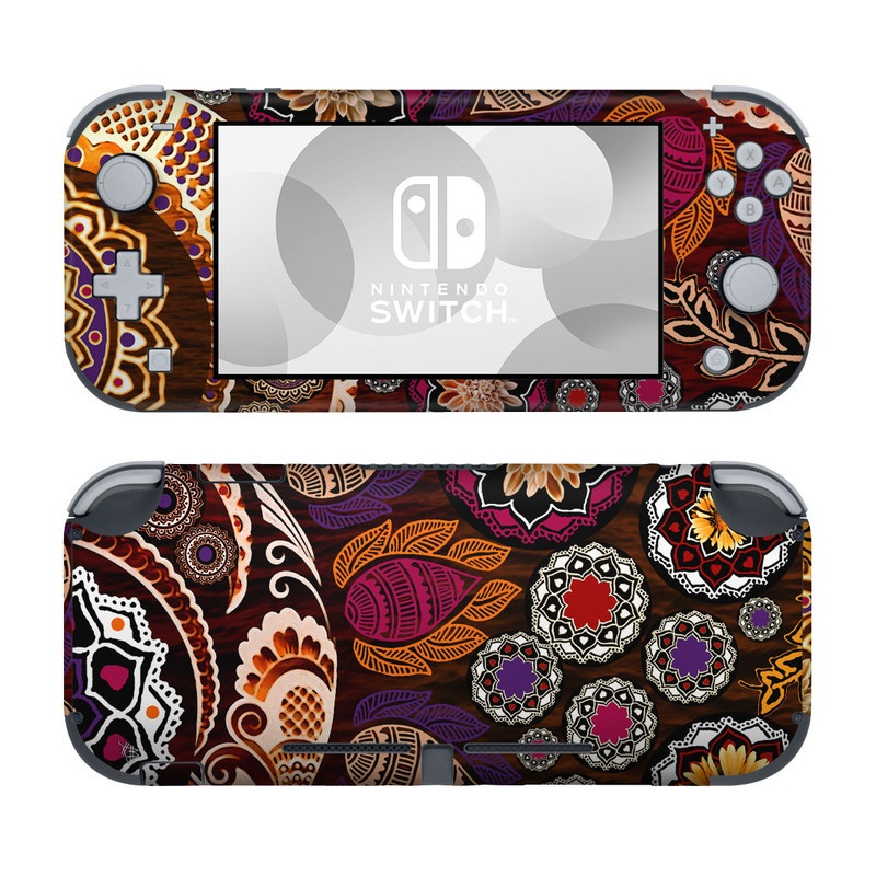iStyles Nintendo Switch Lite Skin design of Pattern, Motif, Visual arts, Design, Art, Floral design, Textile, Paisley, Tapestry, Circle, with brown, purple, red, white, black colors, and tagged with patterns, flowers, nature.