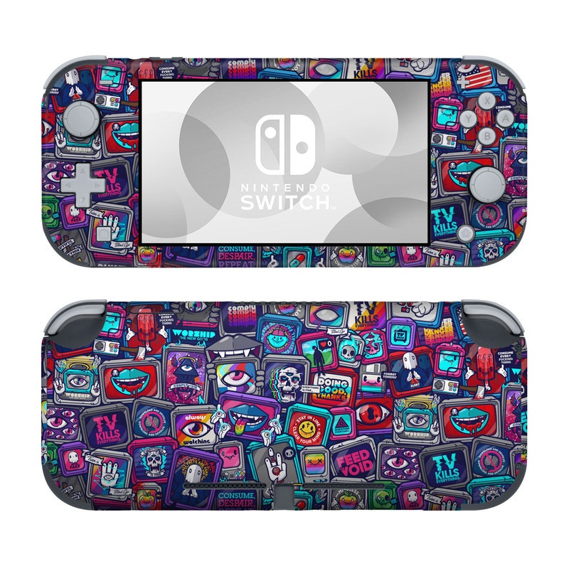 iStyles Nintendo Switch Lite Skin design of Pattern, Font, Art, Visual arts, Collection, with red, blue, black, gray, purple, yellow, white, green colors, and tagged with patterns, objects, signs, skulls, illustration, modern, skull, tattoo, thenewgods, tv, vector.