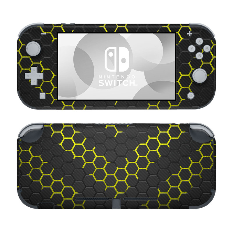 iStyles Nintendo Switch Lite Skin design of Black, Pattern, Yellow, Mesh, Net, Chain-link fencing, Design, Metal, with black, gray, yellow colors, and tagged with lookslike, space, fantasy, animals, drones, geometric, hexagon, tech.