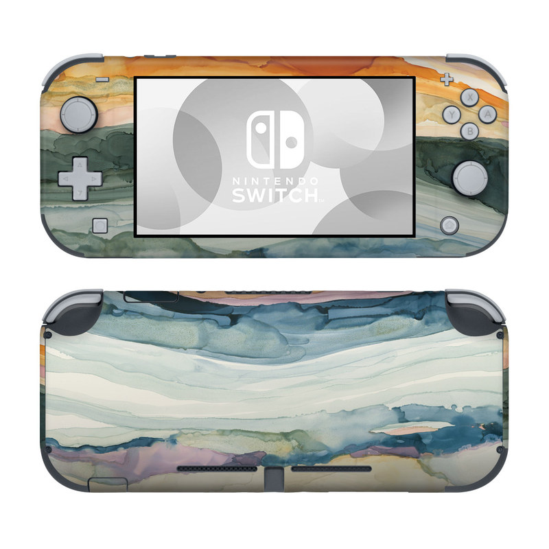 iStyles Nintendo Switch Lite Skin design of Watercolor paint, Painting, Sky, Wave, Geology, Landscape, Pattern, Acrylic paint, Cloud, Paint, with blue, purple, orange, yellow, red, green, brown colors, and tagged with patterns, abstract, nature, abstract, earthy, watercolor.