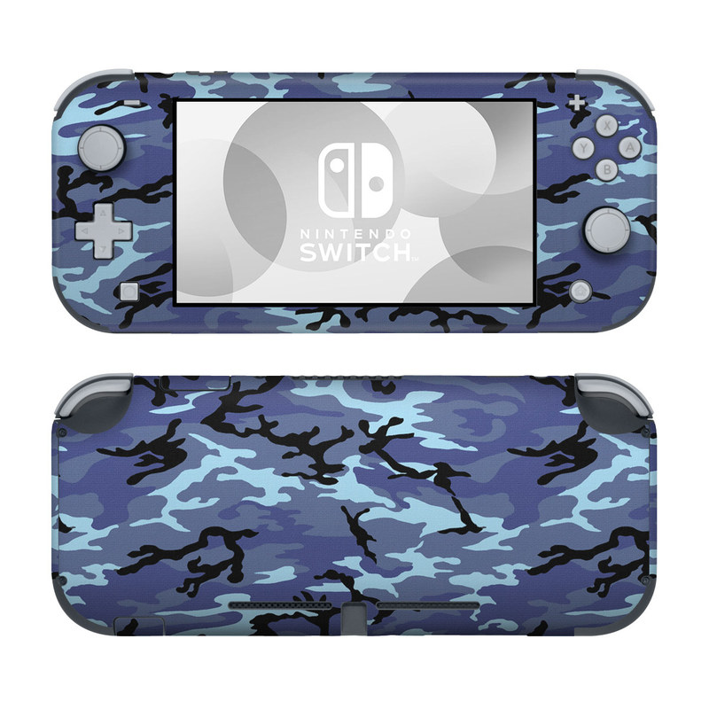 iStyles Nintendo Switch Lite Skin design of Military camouflage, Pattern, Blue, Aqua, Teal, Design, Camouflage, Textile, Uniform, with blue, black, gray, purple colors, and tagged with military, patterns, lookslike.