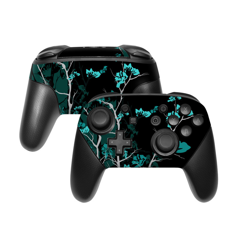 iStyles Nintendo Switch Pro Controller Skin design of Branch, Black, Blue, Green, Turquoise, Teal, Tree, Plant, Graphic design, Twig, with black, blue, gray colors, and tagged with flowers.