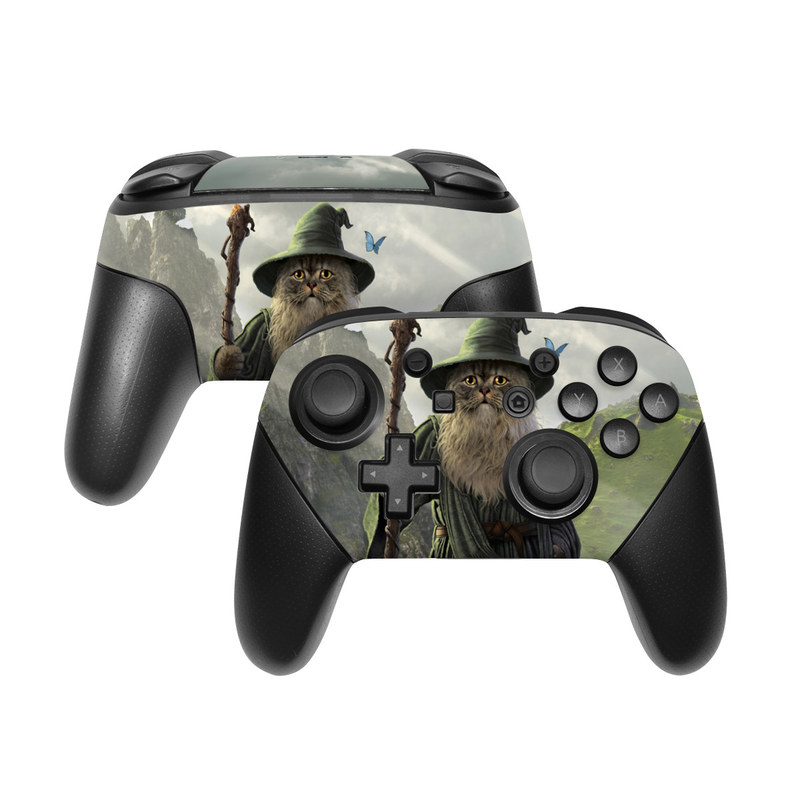 iStyles Nintendo Switch Pro Controller Skin design of Beard, Facial hair, Illustration, Mythology, Magician, Fictional character, Cg artwork, Games, Art, with green, gray, brown, blue, green, white, yellow, black colors, and tagged with animals, fantasy, objects, cat, fantasy, middleearth, movie, movies, wizard, hat, staff.