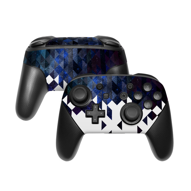 iStyles Nintendo Switch Pro Controller Skin design of Text, Pattern, Graphic design, Font, Purple, Design, Line, Triangle, Logo, Graphics, with black, blue, white colors, and tagged with patterns, space, geometry, space, stars, triangles.