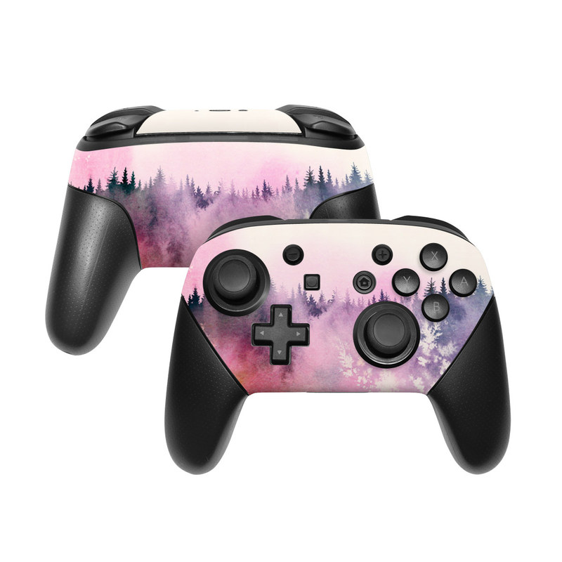 iStyles Nintendo Switch Pro Controller Skin design of Watercolor paint, Sky, Atmospheric phenomenon, Tree, Atmosphere, Cloud, Landscape, Forest, Painting, Illustration, with white, yellow, pink, purple, blue, black colors, and tagged with nature, flowers, floral, nature, pine, plants, trees.