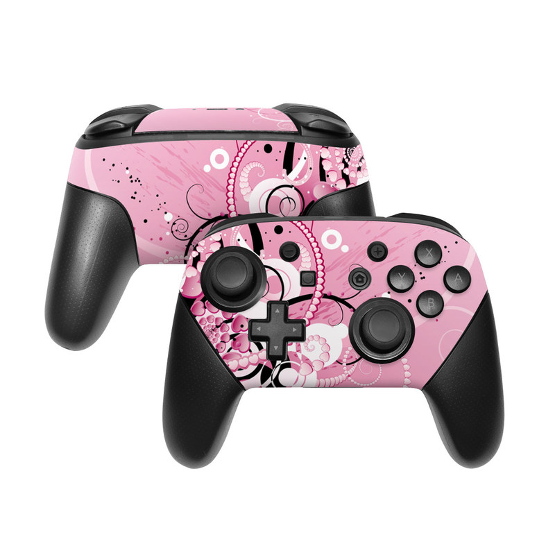 iStyles Nintendo Switch Pro Controller Skin design of Pink, Floral design, Graphic design, Text, Design, Flower Arranging, Pattern, Illustration, Flower, Floristry, with pink, gray, black, white, purple, red colors, and tagged with abstract, hearts.