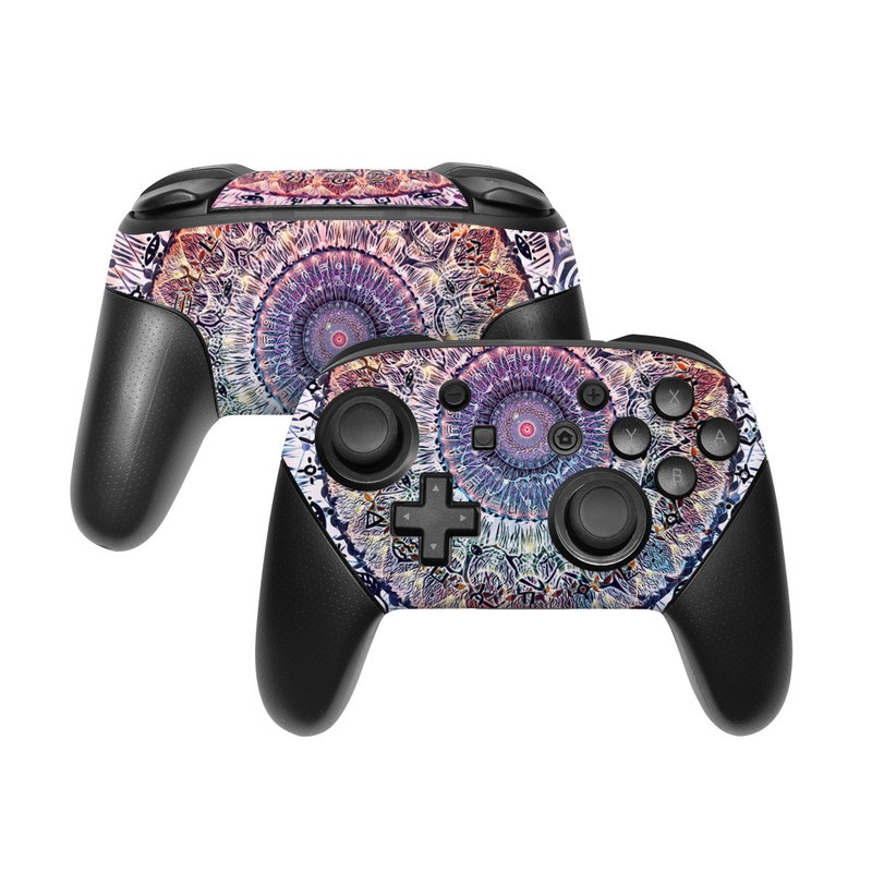 iStyles Nintendo Switch Pro Controller Skin design of Tapestry, Pattern, Art, Close-up, Circle, Fractal art, Textile, Eye, Design, Kaleidoscope, with blue, red, yellow, purple, green colors, and tagged with patterns.