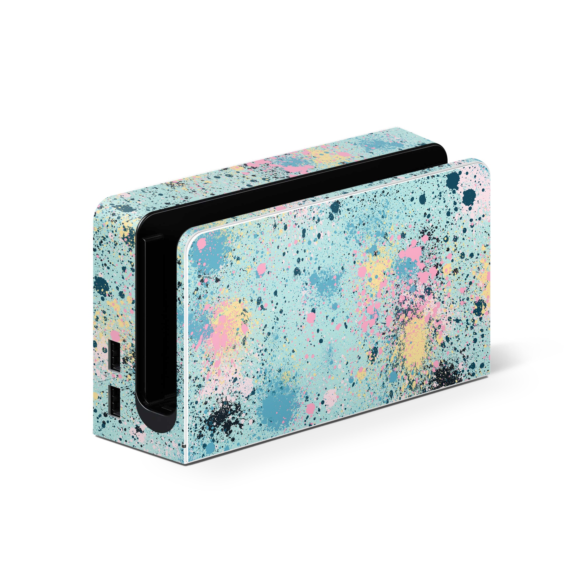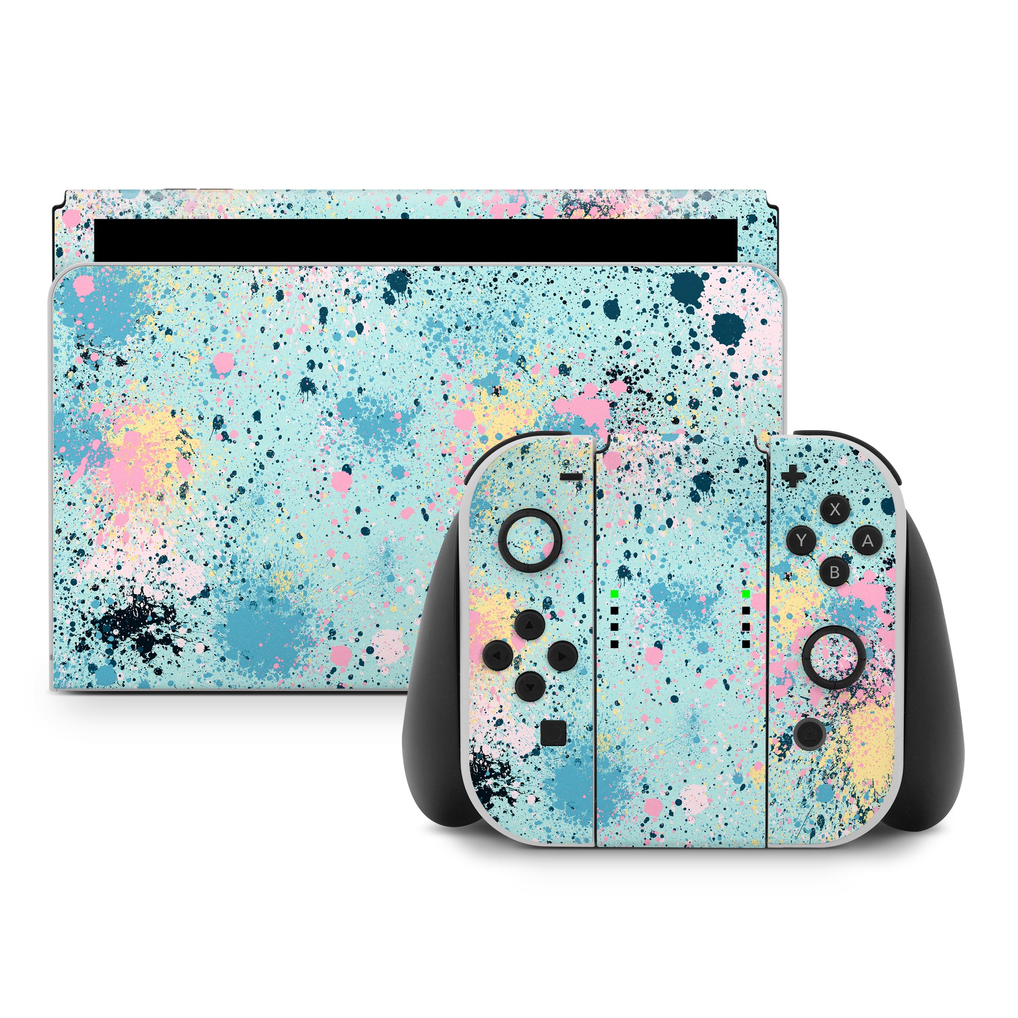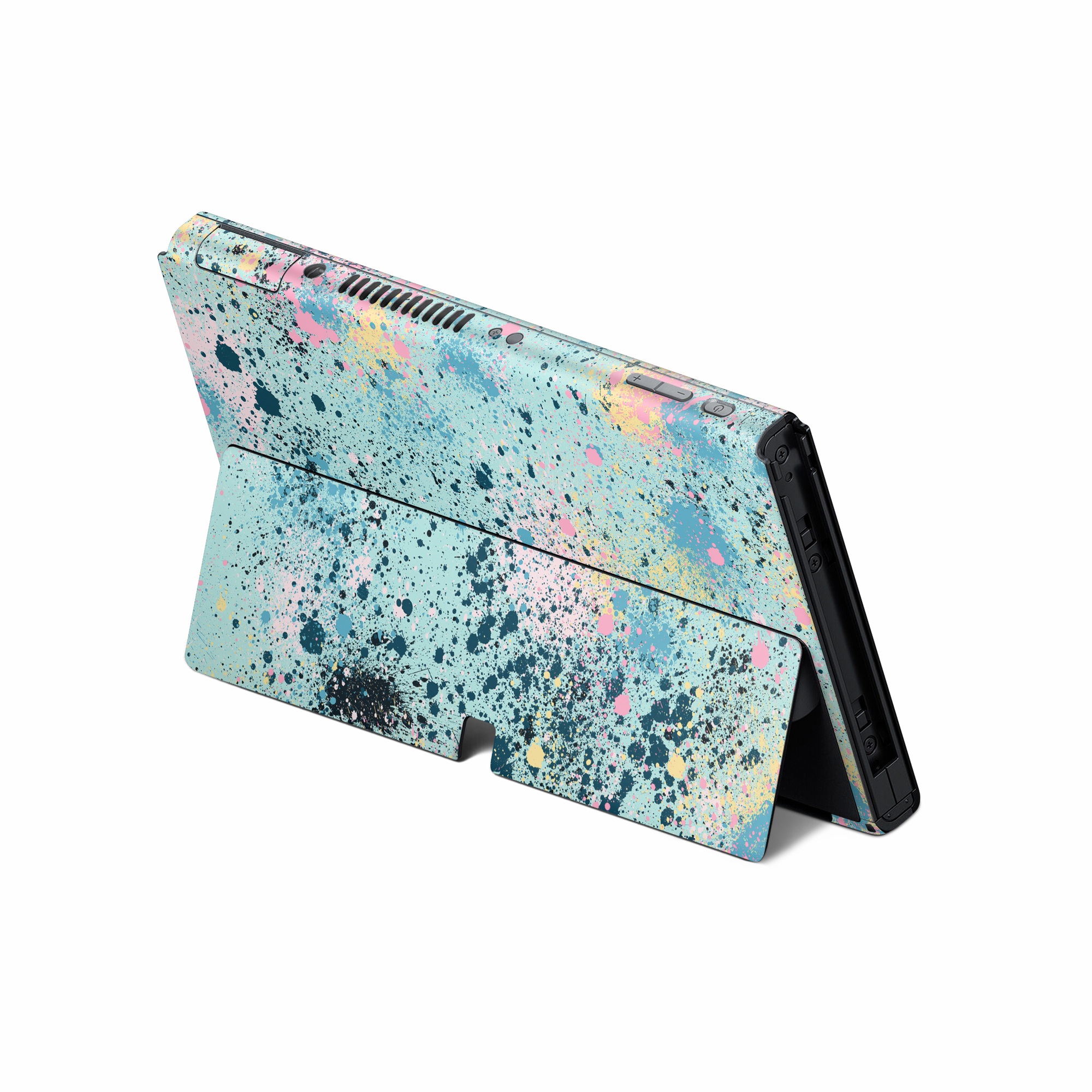 iStyles Nintendo Switch Skin design of Colorfulness, Art, Paint, Aqua, Art paint, Pattern, Tints and shades, Magenta, Electric blue, Creative arts, with blue, black, pink, yellow colors, and tagged with patterns, abstract, blue, collage, ink, paint, pink, splatter, yellow.
