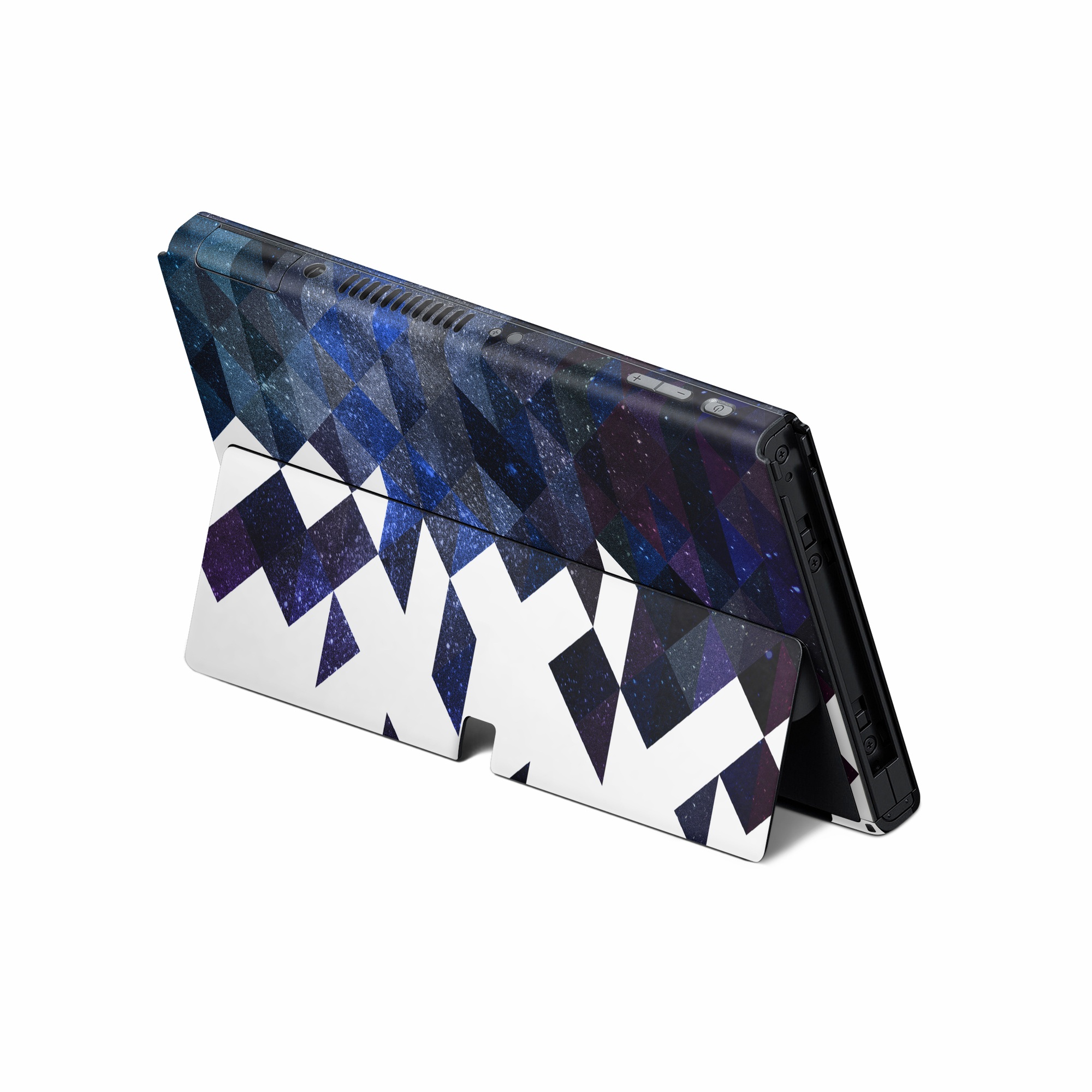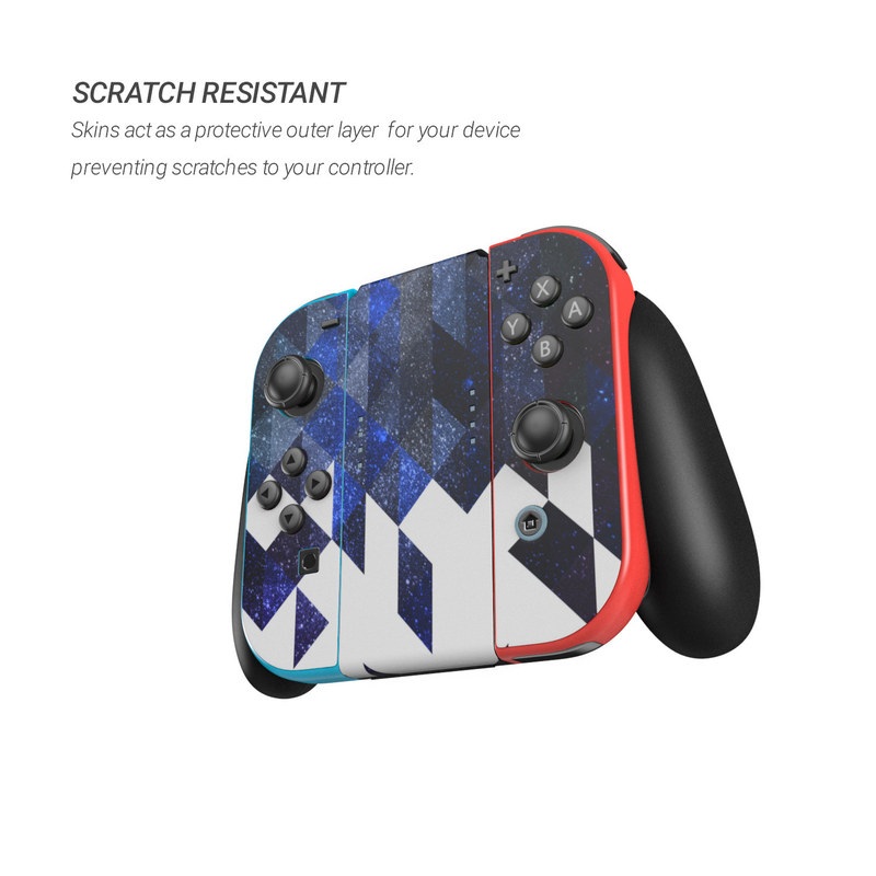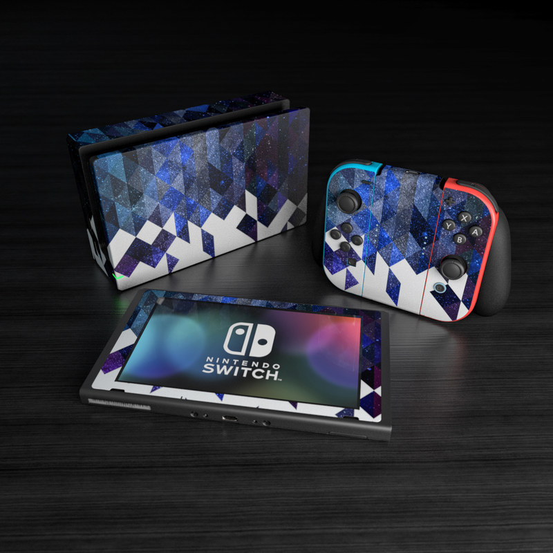 iStyles Nintendo Switch Skin design of Text, Pattern, Graphic design, Font, Purple, Design, Line, Triangle, Logo, Graphics, with black, blue, white colors, and tagged with patterns, space, geometry, space, stars, triangles.