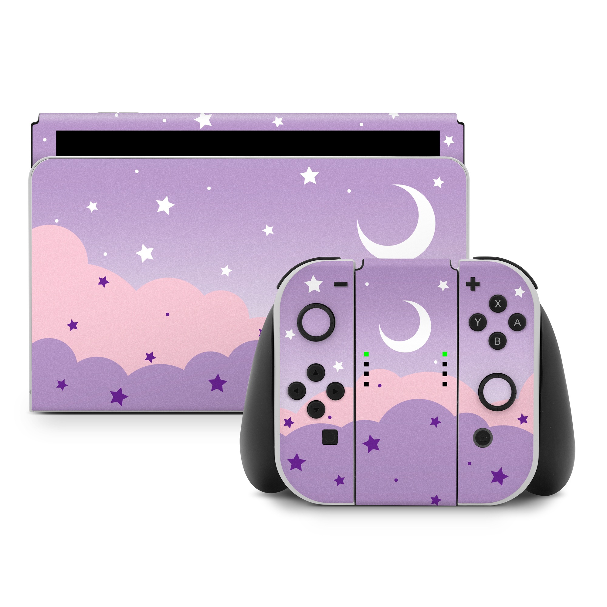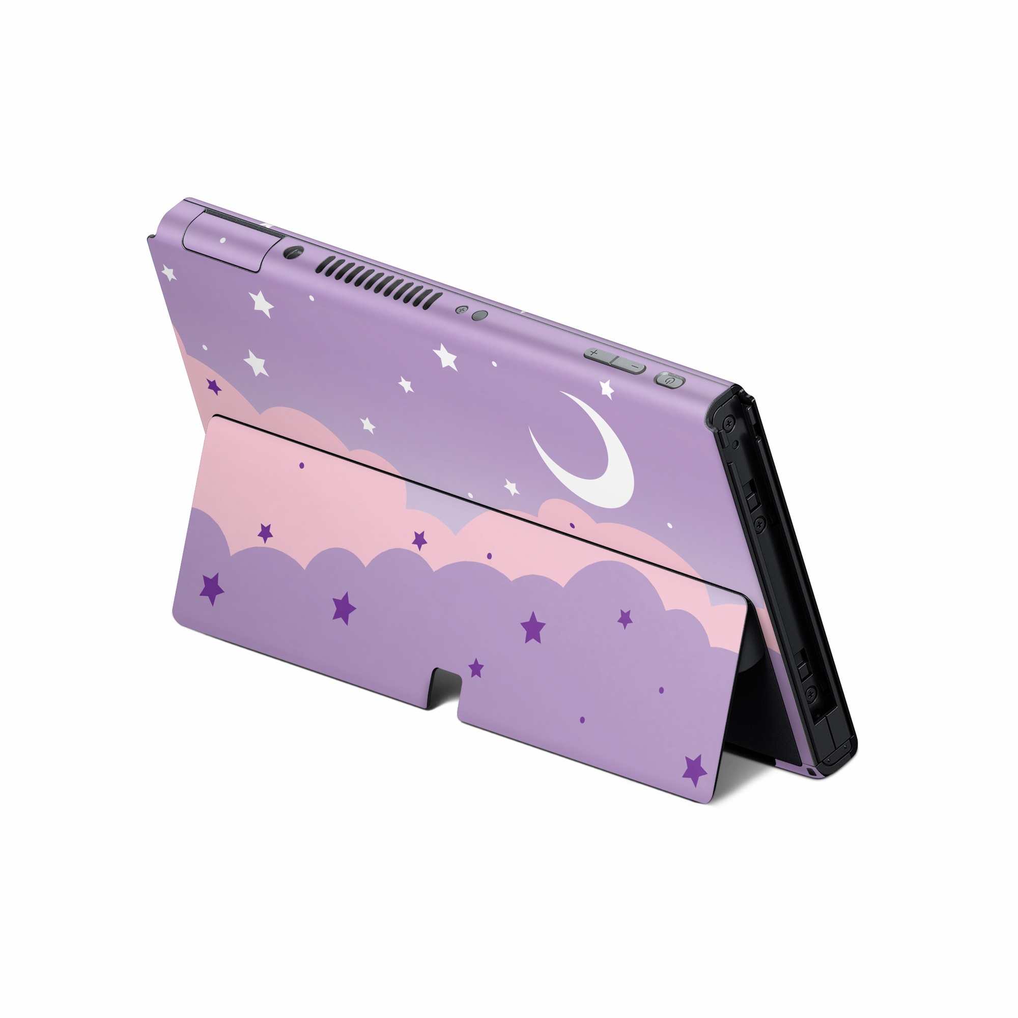 iStyles Nintendo Switch Skin design of Astronomical object, Pink, Star, Purple, Crescent, Moon, Graphics, Animation, Wallpaper, Graphic design, with purple, white colors, and tagged with space, patterns, night, stars, moon, clouds, sky.