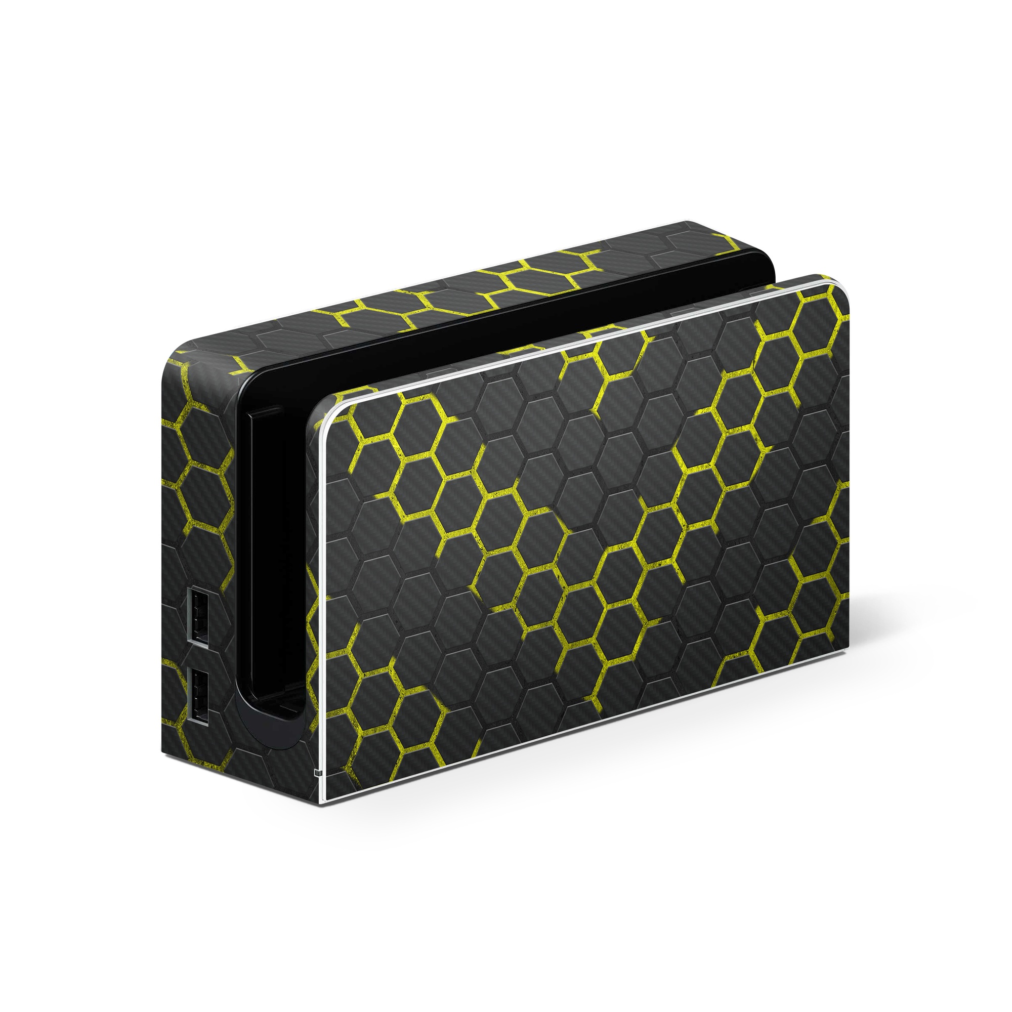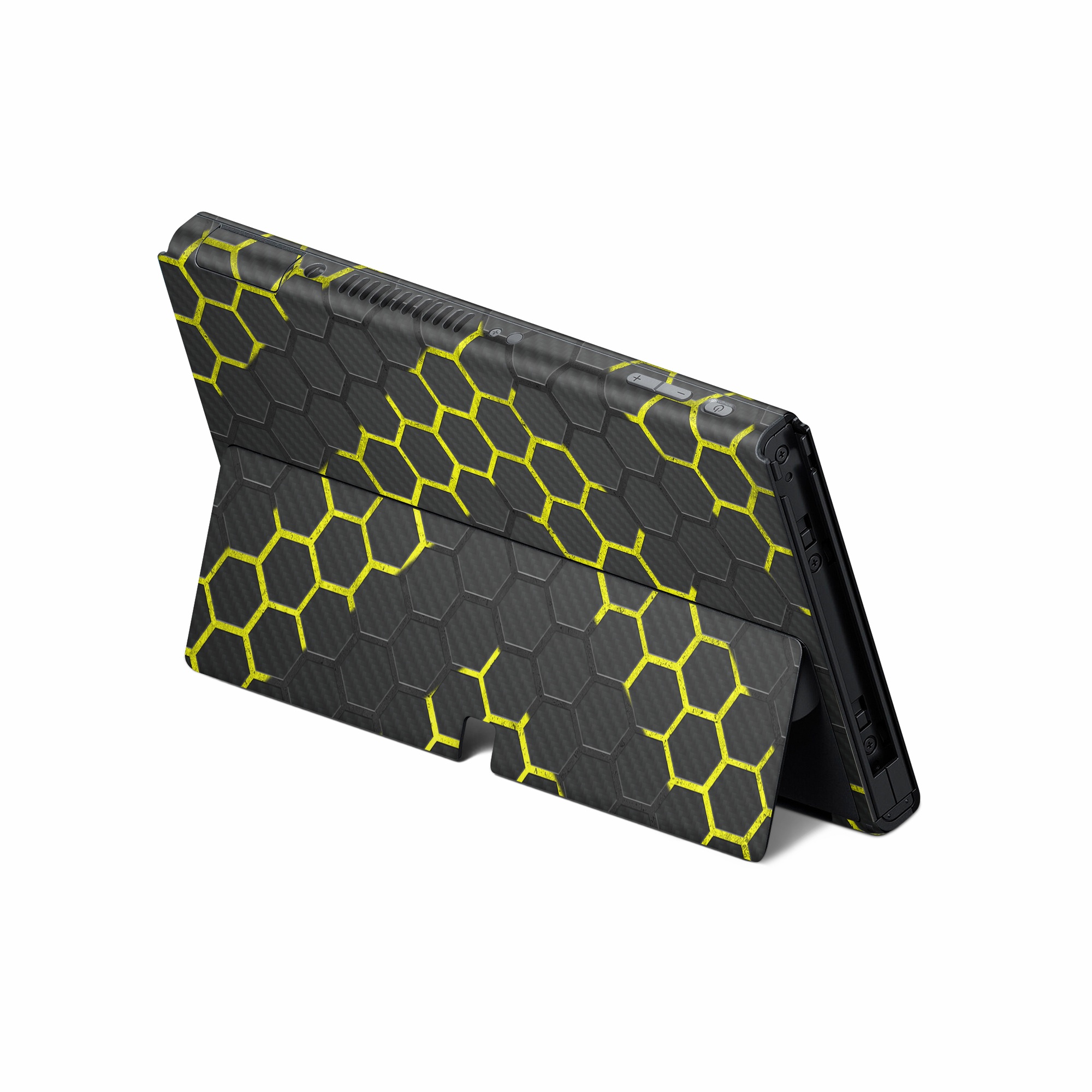 iStyles Nintendo Switch Skin design of Black, Pattern, Yellow, Mesh, Net, Chain-link fencing, Design, Metal, with black, gray, yellow colors, and tagged with lookslike, space, fantasy, animals, drones, geometric, hexagon, tech.