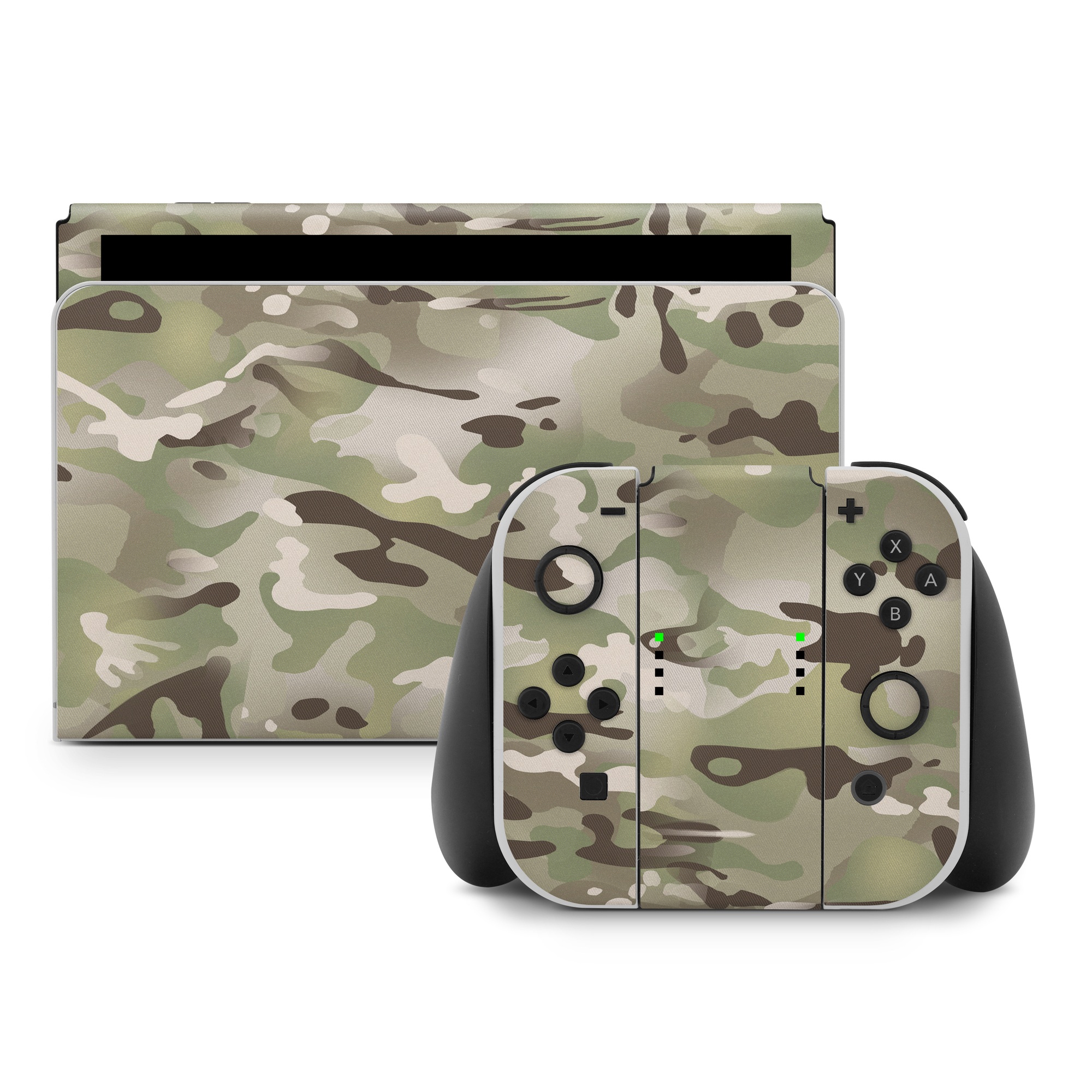 iStyles Nintendo Switch Skin design of Military camouflage, Camouflage, Pattern, Clothing, Uniform, Design, Military uniform, Bed sheet, with gray, green, black, red colors, and tagged with military, lookslike, patterns.