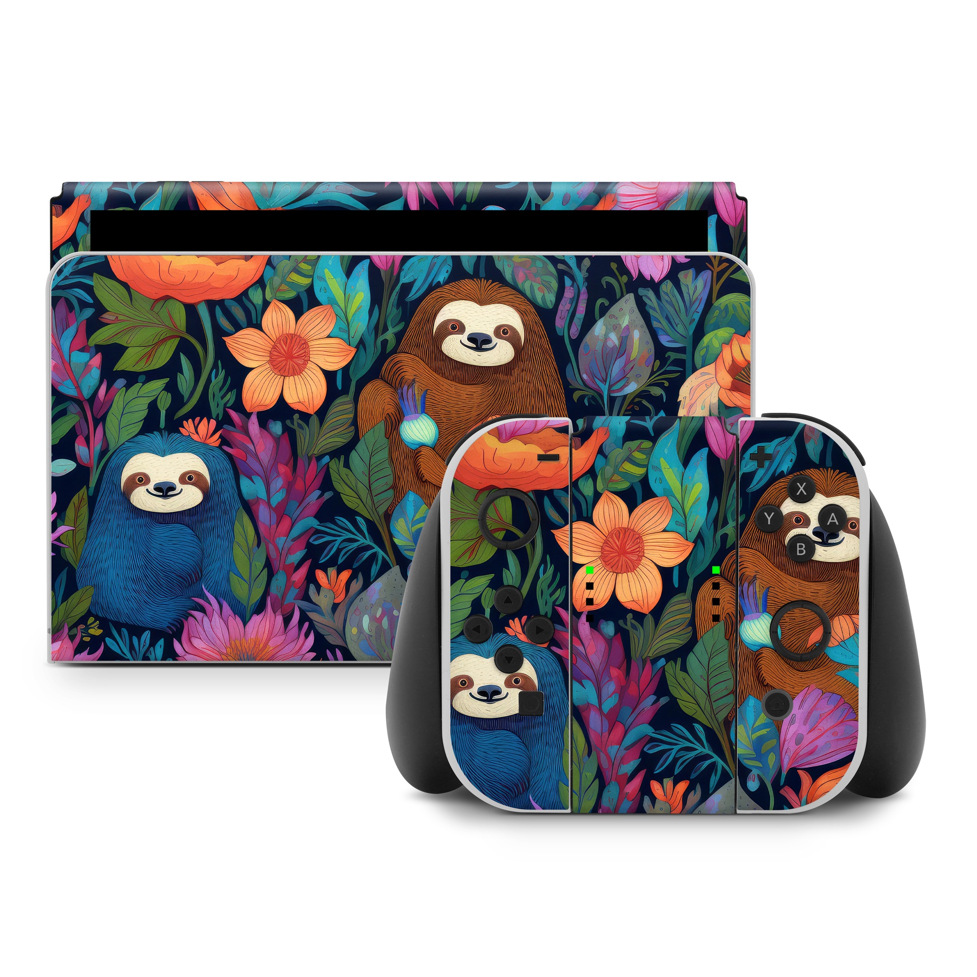iStyles Nintendo Switch Skin design of Flower, Plant, Vertebrate, Botany, Textile, Petal, Mammal, Painting, Creative arts, Grass, with black, brown, blue, white, orange, yellow, red, pink, green colors, and tagged with flowers, animals, nature, sloths, happy, garden.