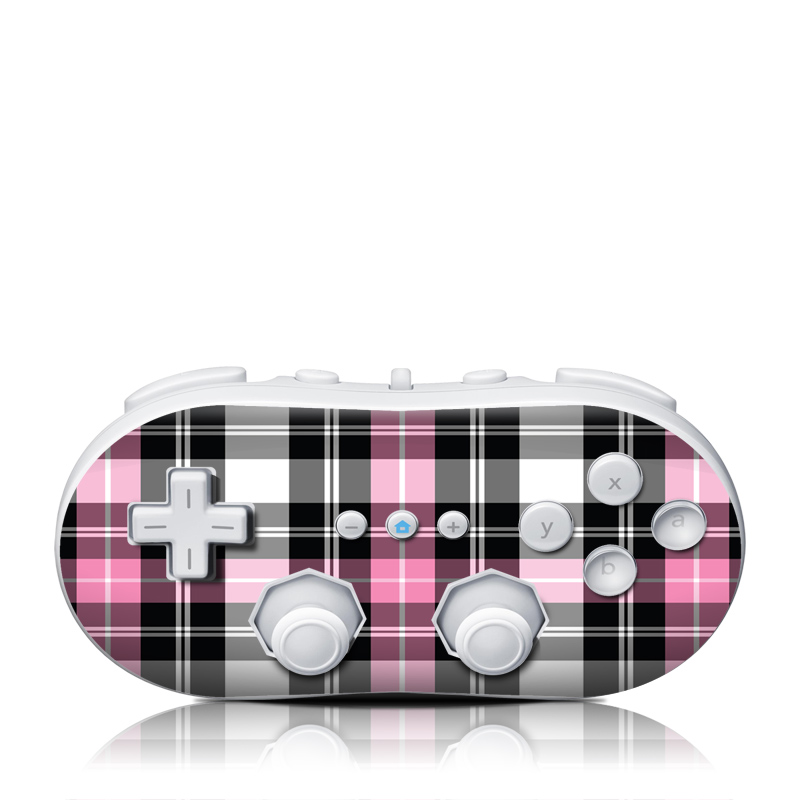 iStyles Wii Classic Controller Skin design of Plaid, Tartan, Pattern, Pink, Purple, Violet, Line, Textile, Magenta, Design, with black, gray, pink, red, white, purple colors, and tagged with patterns.