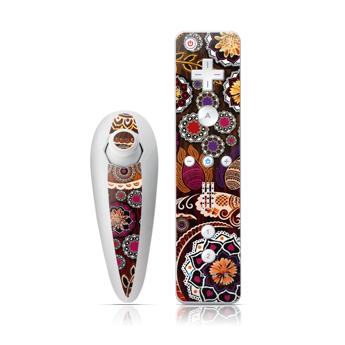 iStyles Wii Nunchuk Remote Skin design of Pattern, Motif, Visual arts, Design, Art, Floral design, Textile, Paisley, Tapestry, Circle, with brown, purple, red, white, black colors, and tagged with patterns, flowers, nature.