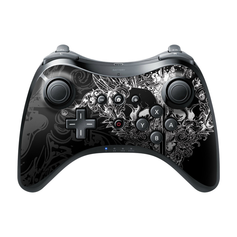 iStyles Wii U Pro Controller Skin design of Illustration, Art, Design, Monochrome, Graphic design, Pattern, Fictional character, Skull, Black-and-white, Graphics, with black, gray colors, and tagged with fantasy, patterns, objects.
