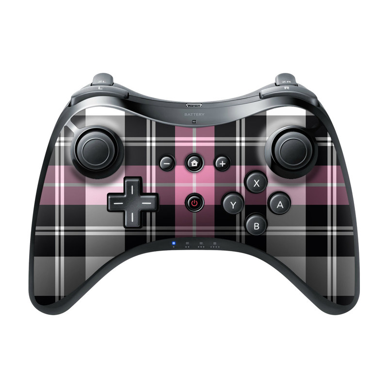 iStyles Wii U Pro Controller Skin design of Plaid, Tartan, Pattern, Pink, Purple, Violet, Line, Textile, Magenta, Design, with black, gray, pink, red, white, purple colors, and tagged with patterns.