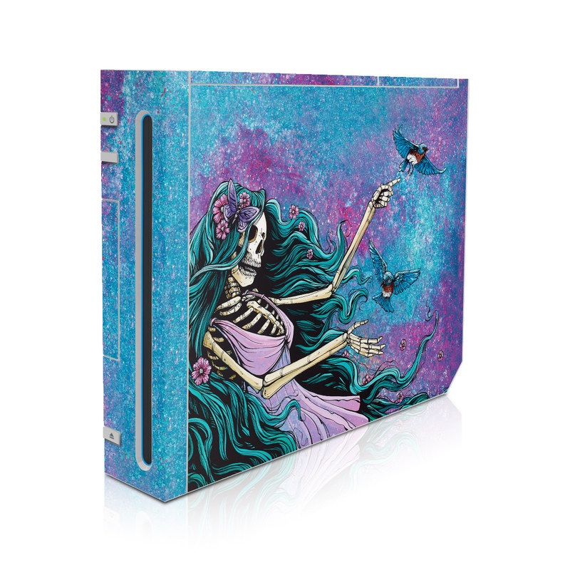 iStyles Wii Skin design of Green, Purple, Painting, Paint, Art, Cg artwork, Mythical creature, Musical instrument, Graffiti, Artist, with blue, purple, white, gray, brown colors, and tagged with skulls, flowers, animals, blue, hair, purple, dress, beautiful, woman, girl, bird.