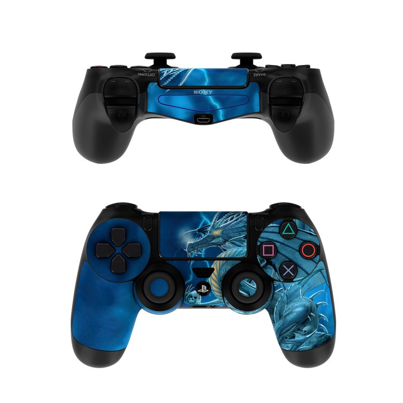 iStyles PlayStation 4 Controller Skin design of Cg artwork, Dragon, Mythology, Fictional character, Illustration, Mythical creature, Art, Demon, with blue, yellow colors, and tagged with fantasy, skulls.