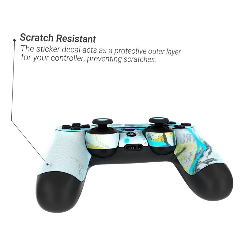 iStyles PlayStation 4 Controller Skin design of Graphic design, Skull, Illustration, Art, Bone, Drawing, Visual arts, Font, Modern art, Street art, with blue, pink, yellow, black colors, and tagged with skulls, abstract.