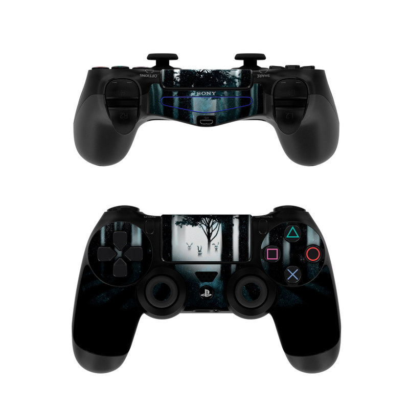 iStyles PlayStation 4 Controller Skin design of Darkness, Black, Nature, Tree, Natural environment, Forest, Atmosphere, Atmospheric phenomenon, Light, Natural landscape, with black, blue, white colors, and tagged with animals, nature, fantasy, space, aliens, creatures, fae, fairy, forest, ghosts, lights, monsters, rabbit, scary, trees, ufo.