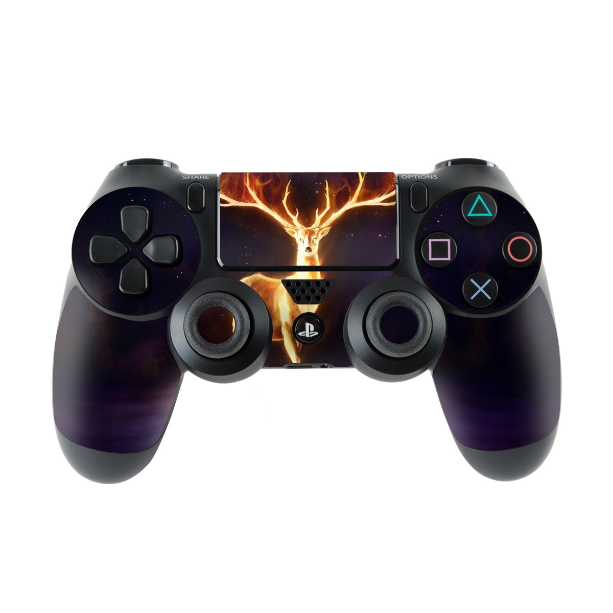 iStyles PlayStation 4 Controller Skin design of Plant, Tree, Organism, Entertainment, Fawn, Art, Heat, Performing arts, Landscape, Sky, with black, yellow, red, orange, purple colors, and tagged with animals, space, fantasy, antlers, deer, fire, glow, sky.