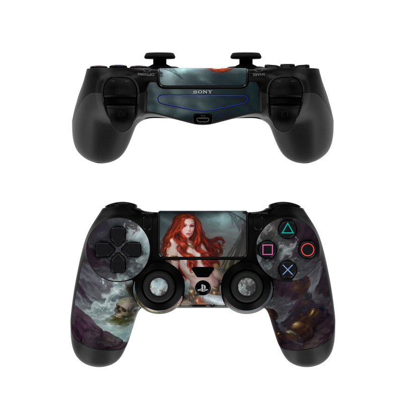 iStyles PlayStation 4 Controller Skin design of Mermaid, Cg artwork, Illustration, Fictional character, Mythology, Mythical creature, Art, Long hair, Woman warrior, Sitting, with black, brown, red, yellow, white, gray colors, and tagged with fantasy, skulls, people, fantasy, mermaid, ocean, pirateships, ships, skull.