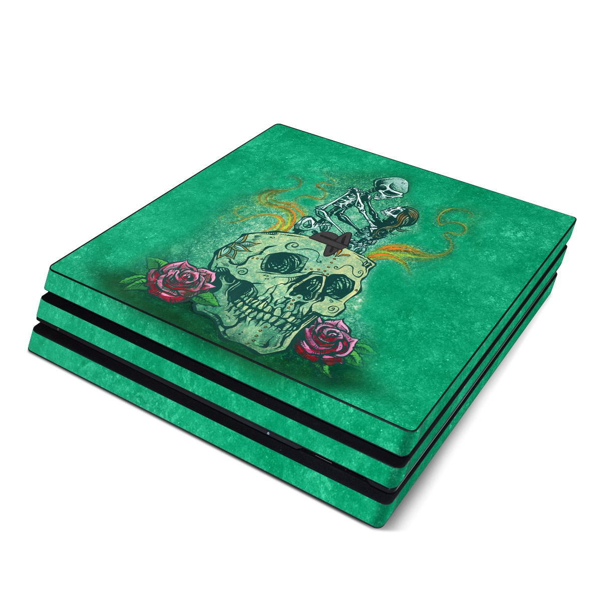 iStyles PlayStation 4 Pro Skin design of Bone, Skull, Aqua, Pattern, Electric blue, Fashion accessory, Font, Fictional character, Art, Grass, with green, pink, red, yellow, orange, white, gray colors, and tagged with skulls, flowers, flames, couple, eternal, love, flames, roses.