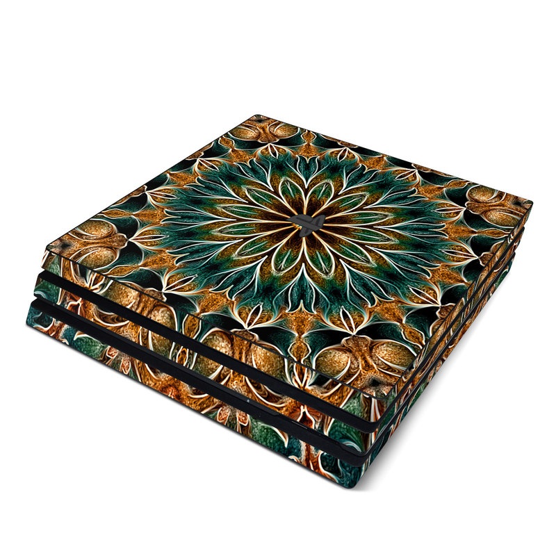 iStyles PlayStation 4 Pro Skin design of Pattern, Symmetry, Textile, Art, Psychedelic art, Tapestry, Design, Visual arts, Kaleidoscope, Motif, with green, orange, yellow, brown, red colors, and tagged with patterns, abstract, orange, teal.