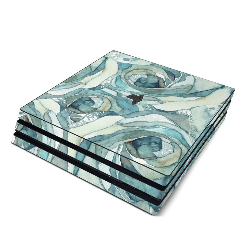 iStyles PlayStation 4 Pro Skin design of Rose, Garden roses, Blue, Flower, Rose family, Watercolor paint, Plant, Pattern, Rosa × centifolia, Blue rose, with blue, green colors, and tagged with patterns, flowers.
