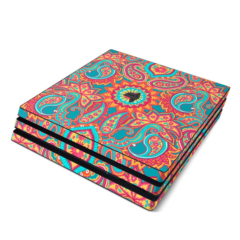 iStyles PlayStation 4 Pro Skin design of Pattern, Paisley, Motif, Visual arts, Design, Art, Textile, Psychedelic art, with orange, yellow, blue, red colors, and tagged with patterns, flowers.
