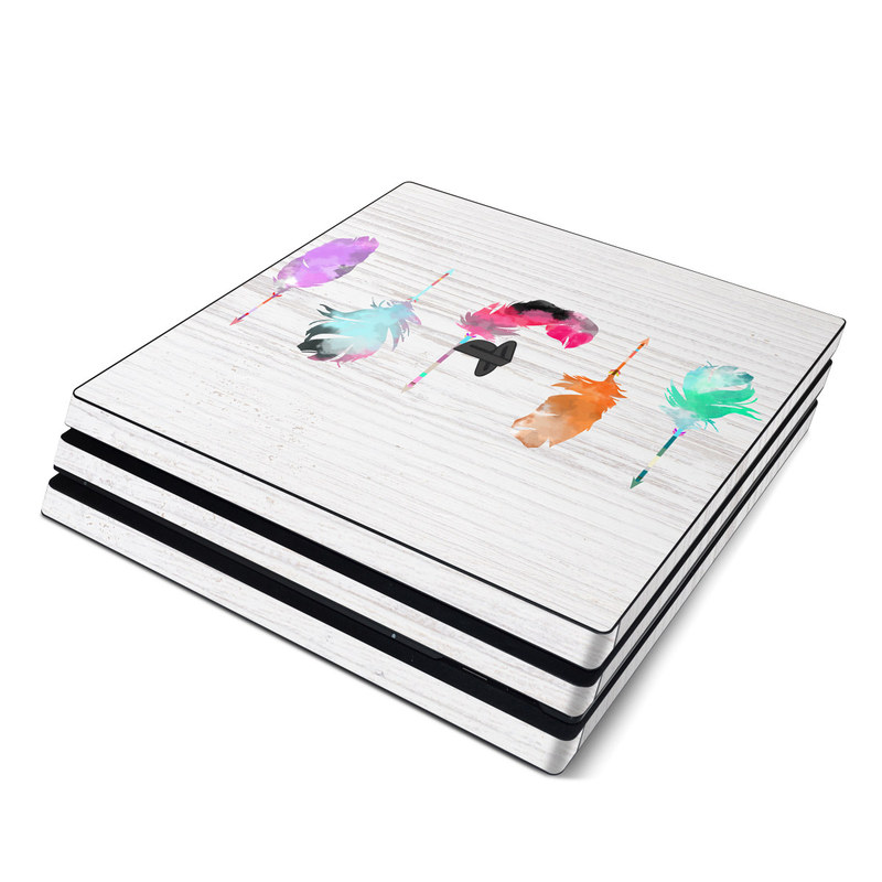 iStyles PlayStation 4 Pro Skin design of Pink, Watercolor paint, Illustration, Feather, Design, Art, Painting, Graphic design, Visual arts, Drawing, with white, orange, red, blue, pink, purple, green colors, and tagged with patterns, objects.