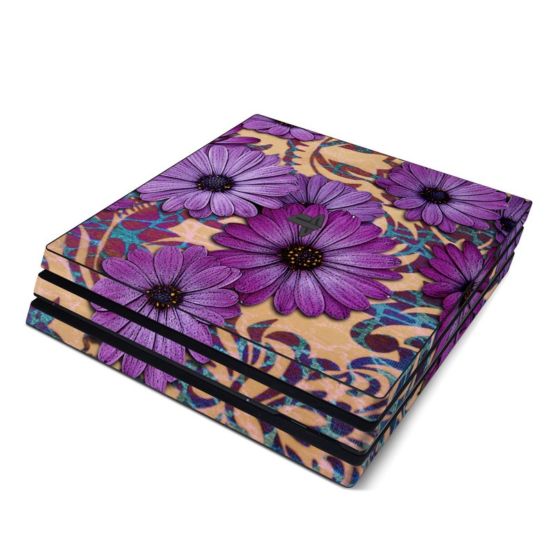 iStyles PlayStation 4 Pro Skin design of Purple, Flower, Violet, Petal, Plant, african daisy, Floral design, Wildflower, Pattern, Textile, with purple, black, gray, blue, green, red colors, and tagged with flowers, patterns.