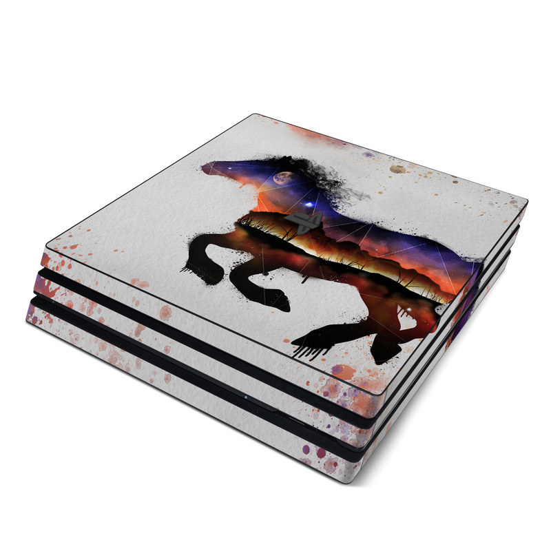 iStyles PlayStation 4 Pro Skin design of Watercolor paint, Illustration, Art, Horse, Paint, Drawing, Graphic design, Painting, Visual arts, Mustang horse, with gray, white, purple, red, yellow, black, orange colors, and tagged with animals, nature, space, animals, horse, moon, nature, night, stars, watercolor.