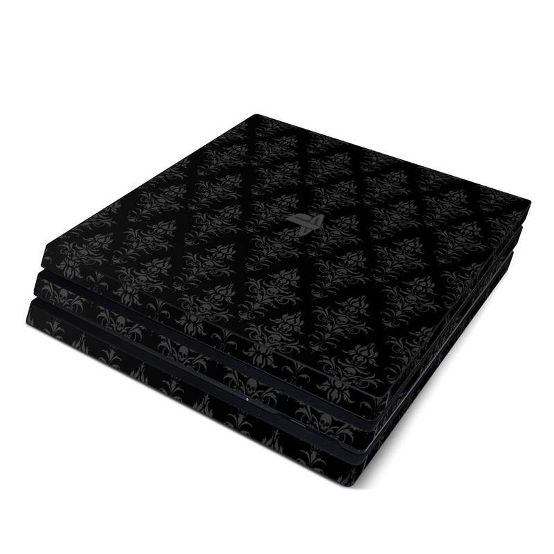 iStyles PlayStation 4 Pro Skin design of Black, Pattern, Design, Monochrome, Black-and-white, Darkness, Monochrome photography, Symmetry, with black, gray colors, and tagged with skulls, patterns.