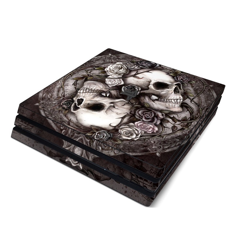 iStyles PlayStation 4 Pro Skin design of Skull, Bone, Illustration, Font, Still life photography, Photography, Still life, Art, Monochrome, Circle, with black, white, brown, pink colors, and tagged with skulls, flowers, fantasy, objects, bones, gothic, roses, skull, steampunk.