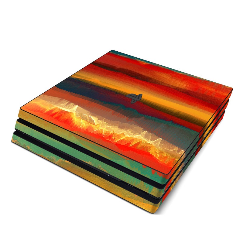 iStyles PlayStation 4 Pro Skin design of Sky, Red, Horizon, Afterglow, Orange, Painting, Acrylic paint, Watercolor paint, Sunset, Geological phenomenon, with red, blue, green, yellow, orange, white colors, and tagged with patterns, abstract, abstract, bright, layers, marble, painting.