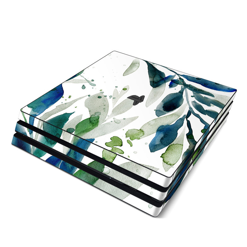 iStyles PlayStation 4 Pro Skin design of Leaf, Branch, Plant, Tree, Botany, Flower, Design, Eucalyptus, Pattern, Watercolor paint, with white, blue, green, gray colors, and tagged with nature, blue, filigree, green, leaf, leaves, nature, outdoors, pastel, watercolor.