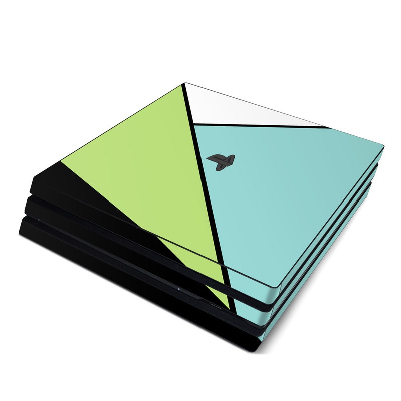 iStyles PlayStation 4 Pro Skin design of Green, Line, Blue, Triangle, Design, Parallel, Pattern, Graphic design, Slope, with white, black, green, blue colors, and tagged with patterns, block, blocking, color, colorblock, geometric, shape, simple.