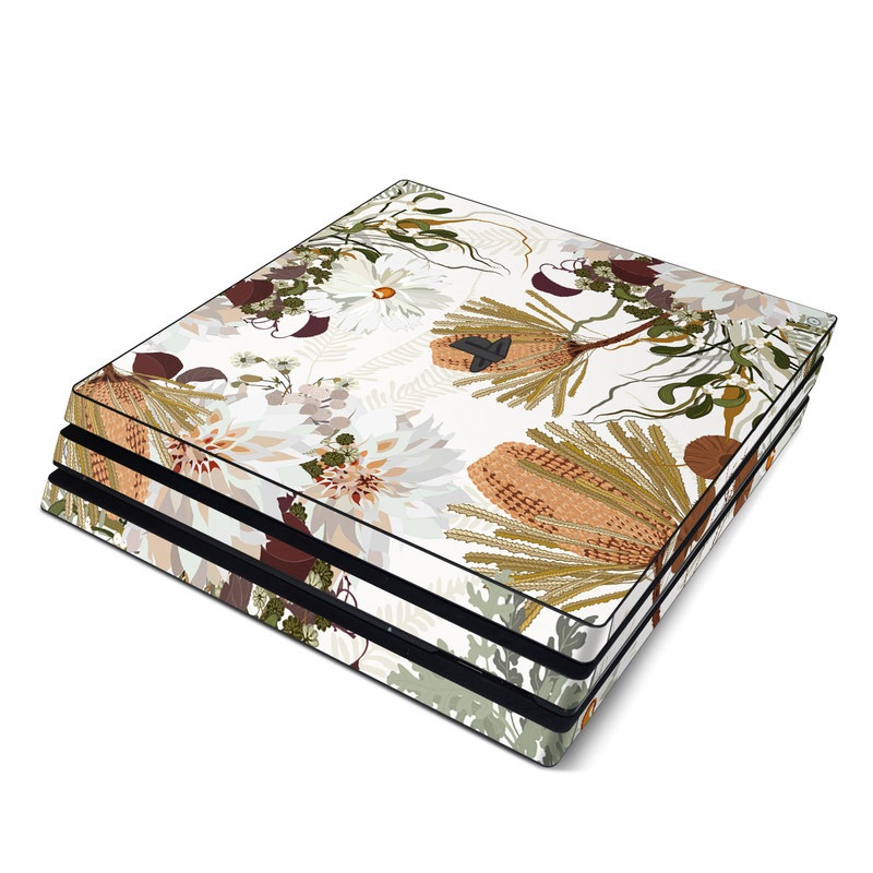 iStyles PlayStation 4 Pro Skin design of Flower, Botany, Plant, Floral design, Wildflower, Pattern, Wallpaper, Textile, Petal, Butterfly, with white, brown, green, gray colors, and tagged with nature, patterns, flowers, brown, cream, filigree, floral, flower, flowers, green, leaf, leaves, nature, neutral, outdoor.