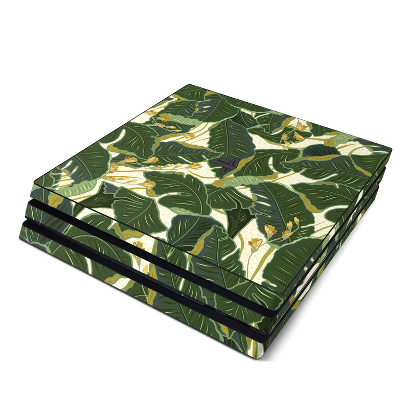 iStyles PlayStation 4 Pro Skin design of Leaf, Plant, Flower, Pattern, Botany, Tree, Design, Flowering plant, Arrowroot family, Terrestrial plant, with green, yellow colors, and tagged with patterns, flowers, nature, filigree, floral, leaves, palmleaves, palms, pattern.
