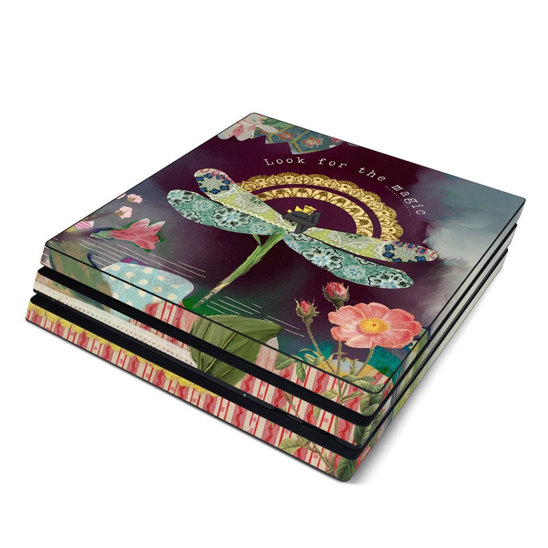 iStyles PlayStation 4 Pro Skin design of Leaf, Textile, Plant, Art, Creative arts, Font, Poster, Painting, Pattern, Paint, with white, yellow, green, blue, pink, red colors, and tagged with signs, flowers, animals, dragonfly, flower, flowers, insect, inspiration, quote, quotes, scrapbook.