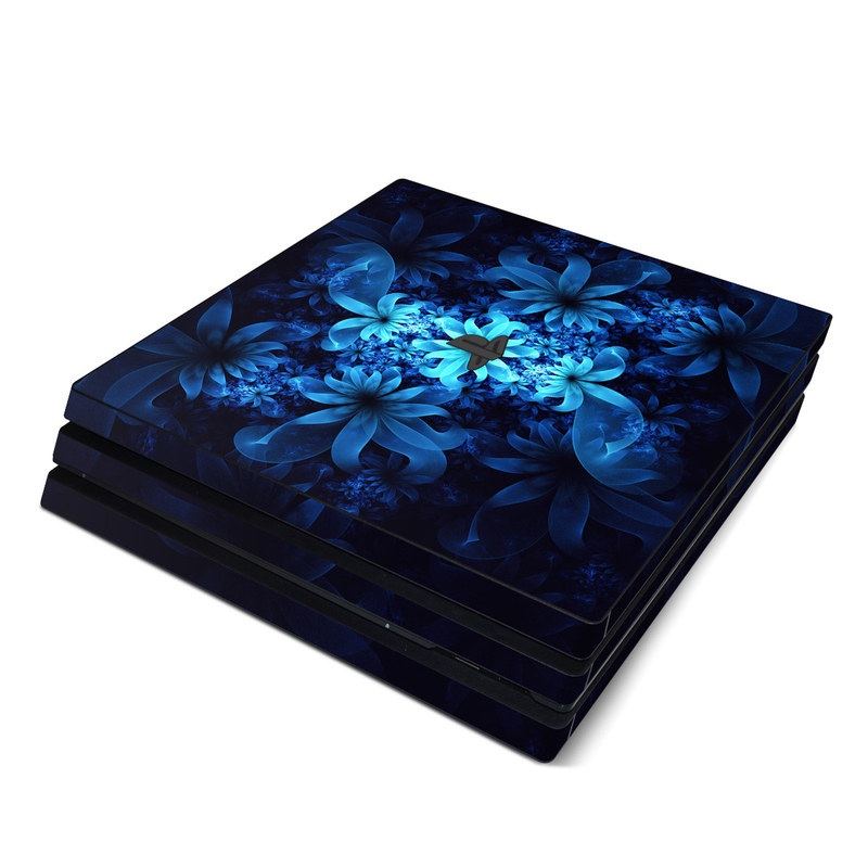 iStyles PlayStation 4 Pro Skin design of Nature, Blue, Petal, Organism, Darkness, Flower, Colorfulness, Electric Blue, Majorelle Blue, Pattern, Botany, Still Life Photography, Space, Aquatic Plant, Fractal Art, Visual Arts, Illustration, Symmetry, Midnight, Wildflower, Painting, Still Life, with black, blue, white colors, and tagged with flowers, patterns, blue, fantasy, flower, flowers, garden, glow, light.