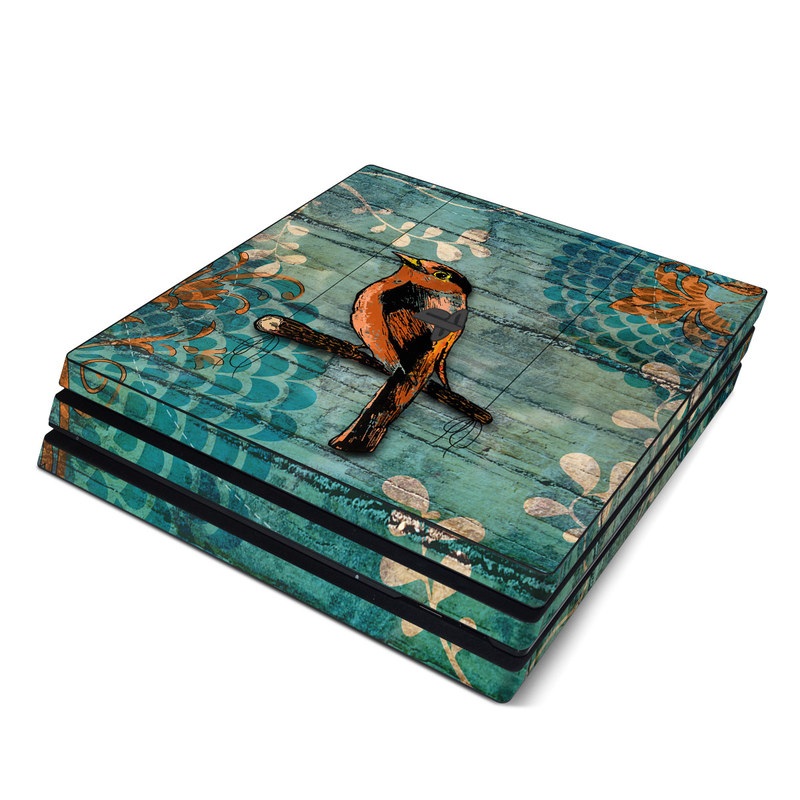 iStyles PlayStation 4 Pro Skin design of Bird, Turquoise, Painting, Art, Coraciiformes, Branch, Beak, Wildlife, Perching bird, Illustration, with black, blue, gray, green, red colors, and tagged with animals, flowers, nature, patterns.