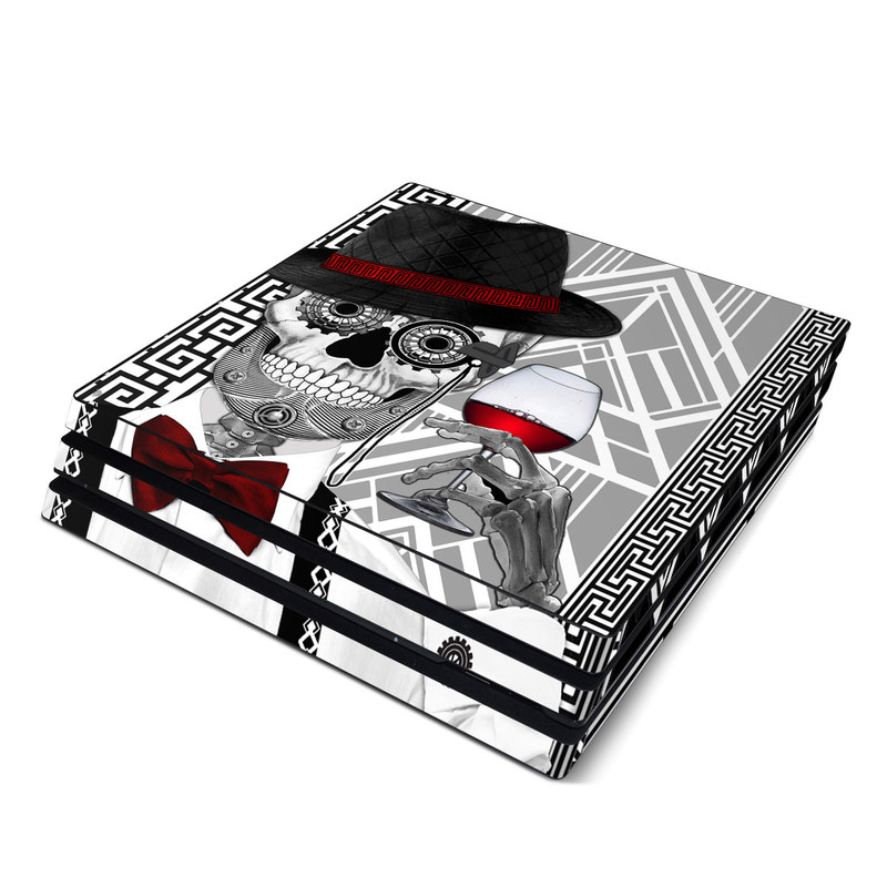 iStyles PlayStation 4 Pro Skin design of Cartoon, Poster, Font, Illustration, Headgear, Games, Photo caption, Fictional character, Graphic design, Hat, with black, white, red colors, and tagged with skulls, objects, patterns, 1920's, artdeco, blackandwhite, calavera, dayofthedead, diadelosmuertos, flapper, greatgatsby, newmexico, pattern, skeleton, skull, sugarskull, vanderbone, wine.