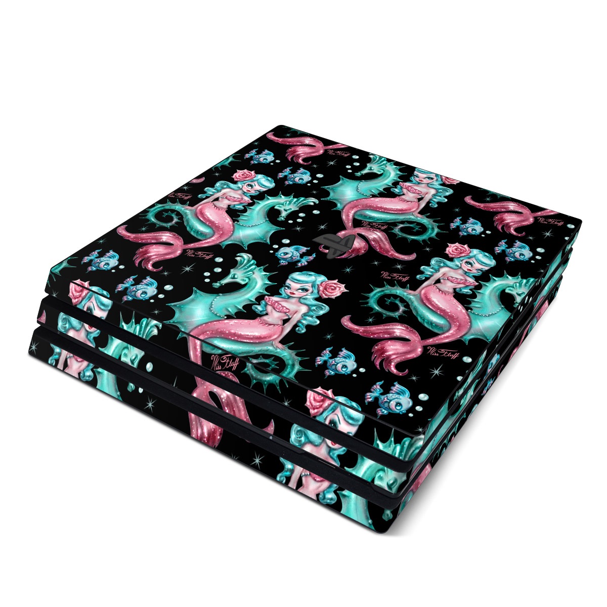 iStyles PlayStation 4 Pro Skin design of Pink, Pattern, Illustration, Organism, Design, Art, Textile, Visual arts, Graphic design, Fictional character, with black, green, pink, yellow colors, and tagged with fantasy, animals, flowers, beach, fish, glamor, mermaids, pinup, seahorses.