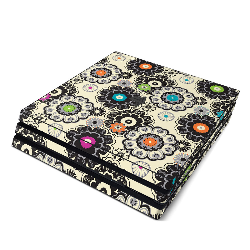 iStyles PlayStation 4 Pro Skin design of Pattern, Circle, Design, Visual arts, Floral design, Textile, Psychedelic art, Art, Plant, with gray, black, pink, green, purple colors, and tagged with patterns, flowers.