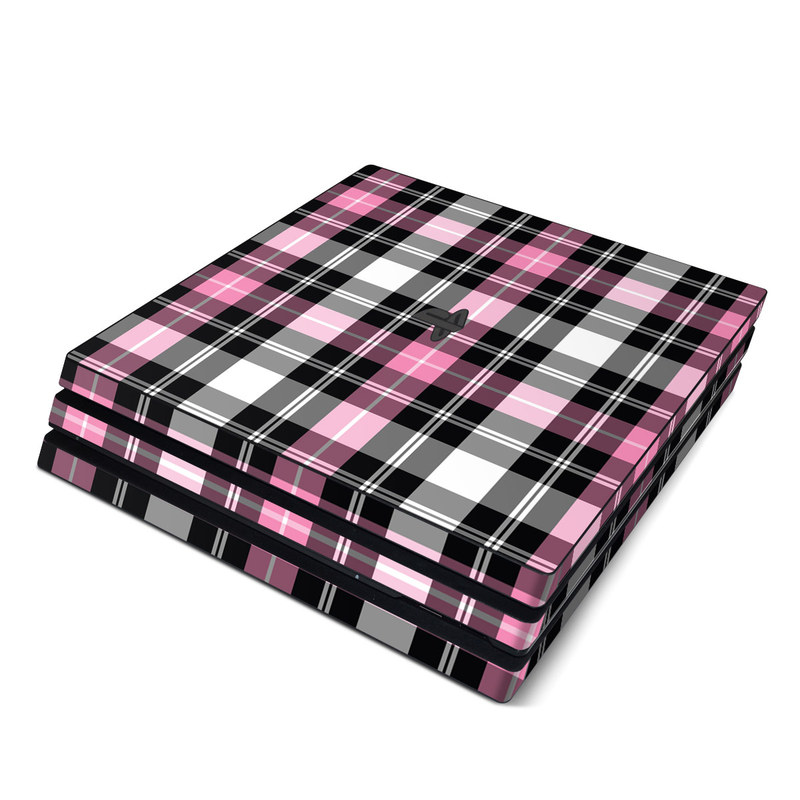 iStyles PlayStation 4 Pro Skin design of Plaid, Tartan, Pattern, Pink, Purple, Violet, Line, Textile, Magenta, Design, with black, gray, pink, red, white, purple colors, and tagged with patterns.